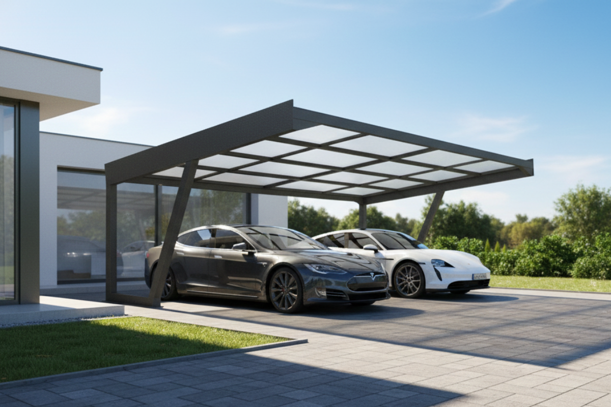 Samostatné ocelové konstrukce pro vstupy, terasy nebo parkování.